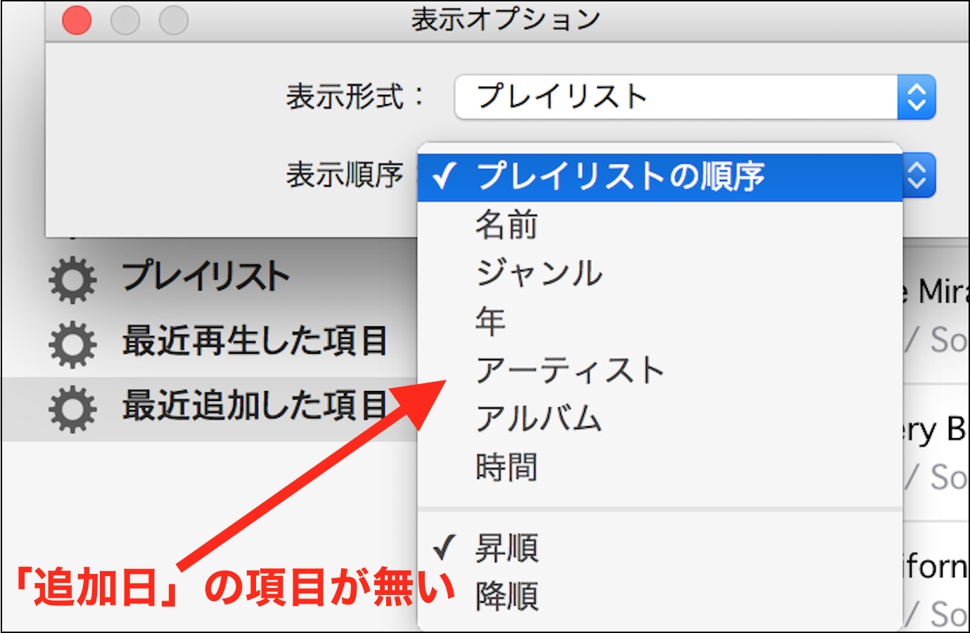 (一旦、表示形式が「曲」の時に表示順序の選択項目で「追加日」を追加すると、表示形式が「プレイリスト」の
