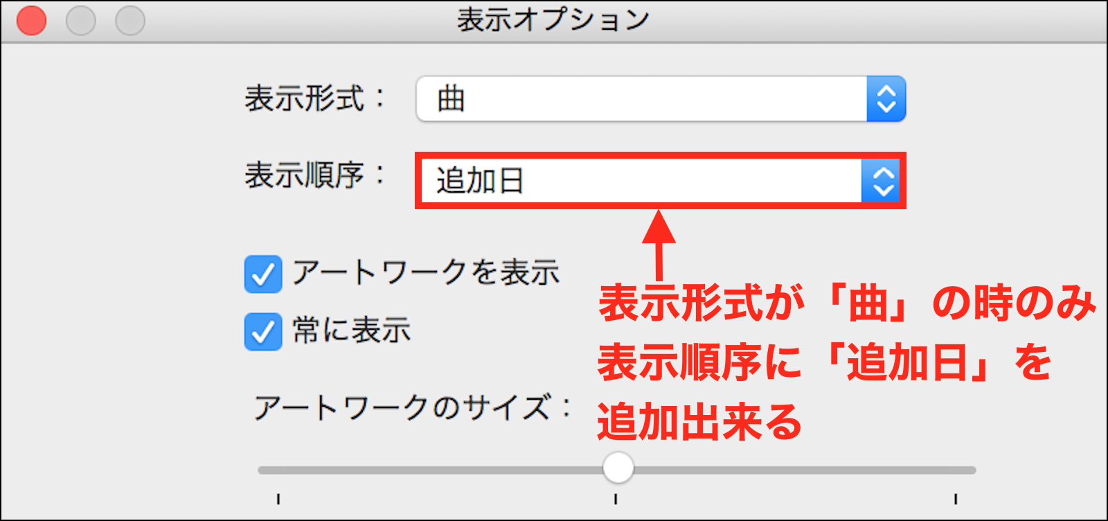 成る程、表示形式が「曲」の時のみ、表示順序の選択項目に「追加日」を追加出来るんですね。