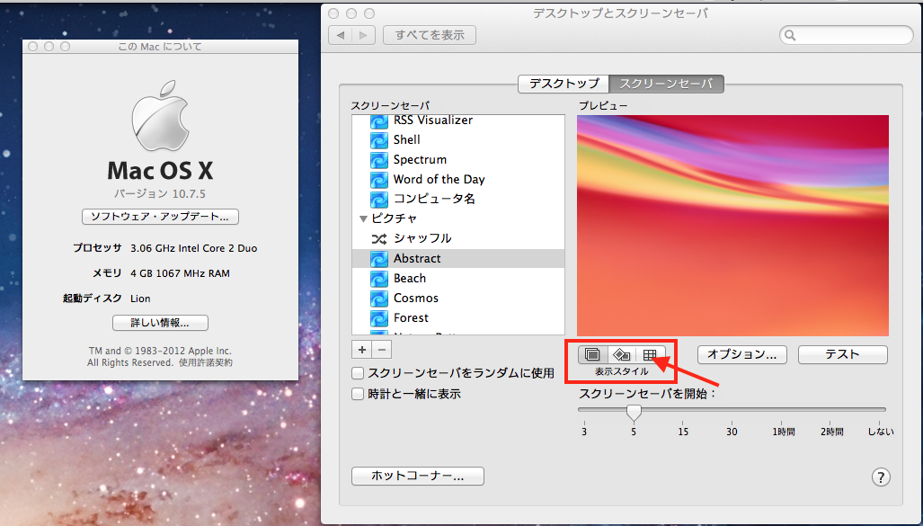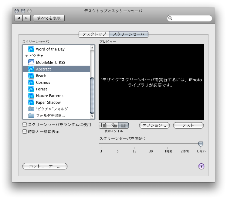 なので、もしilcion さんが Mac OS X Leopard(10.5.x)以前のバージョンをお使いで、最近 Mac OS X Snow Leopard(10.6.x)以降にアップグレードされたのなら、「スクリーンセーバ」タブ に「表示スタイル」の「モザイク」ボタンが無いのは仕様だと思います。