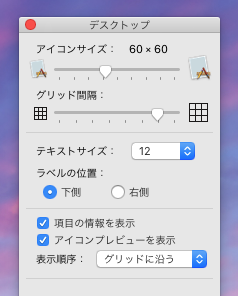 「アイコンサイズ」「グリッド間隔」「アイコンプレビューを表示」等の設定を切り替えてみる、あるいはアイコンを移動する