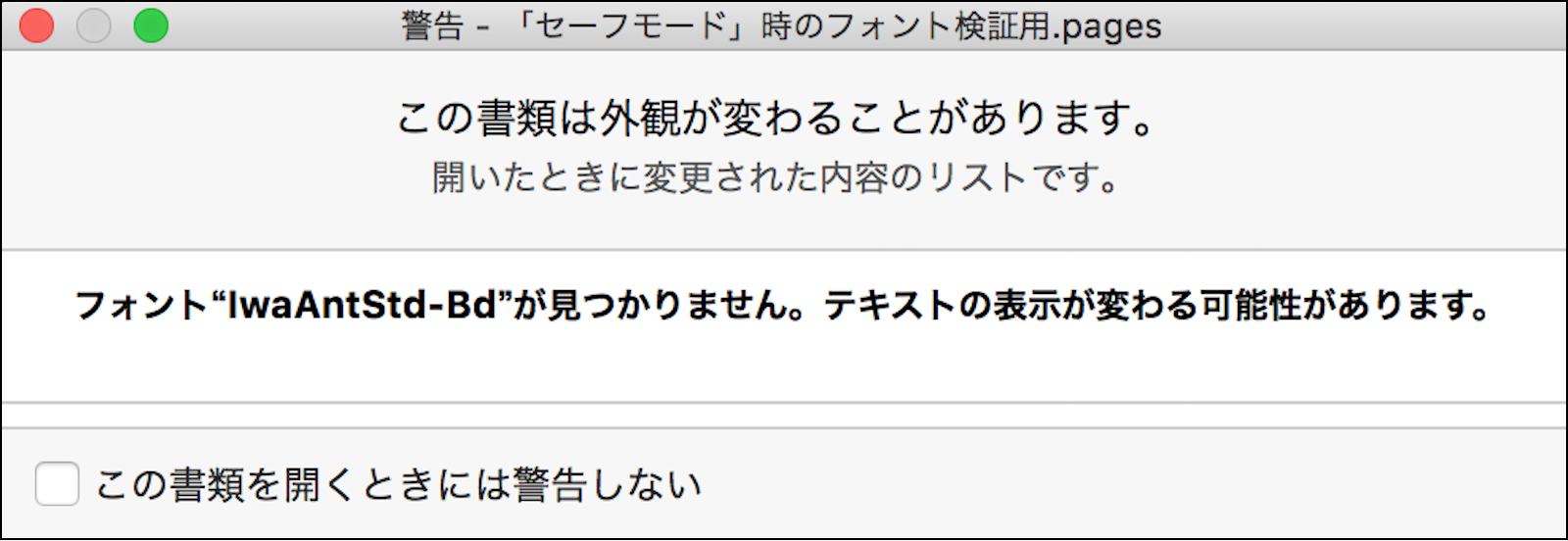 「Pages(5.6.2)」で「I-OTFアンチックStd(IwaAntStd-Bd)」フォントを使用した書類を開くと、下の画像