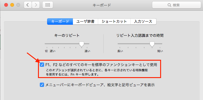 システム環境設定のキーボードの F1,F2などの・・・にはチェックを入れてください。