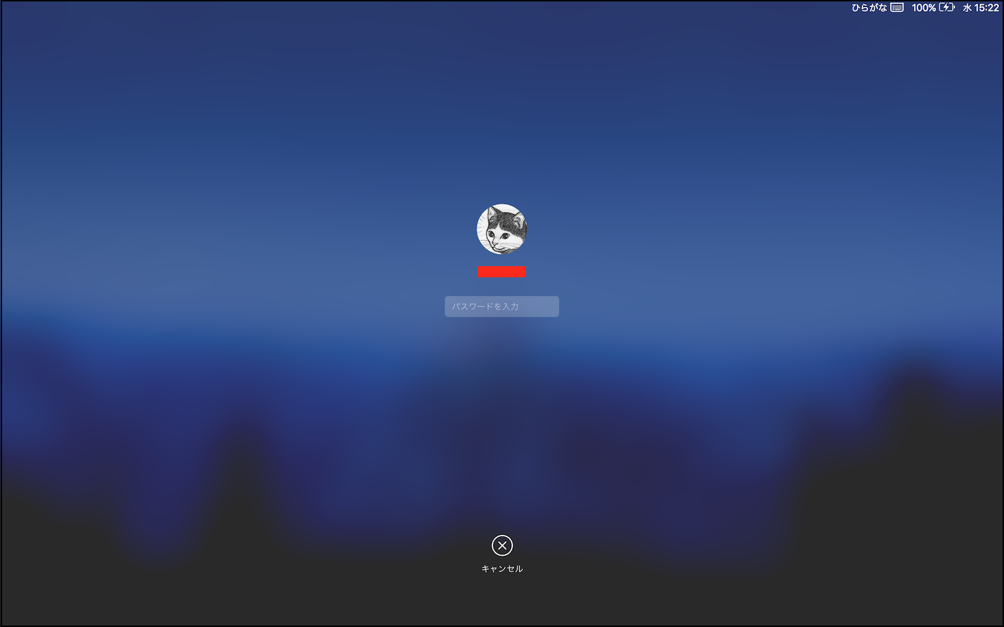 ログイン時のパスワード入力画面と同じもの、ただし表示される下のボタンにはシステム終了、再起動がなくキャンセルのみ。