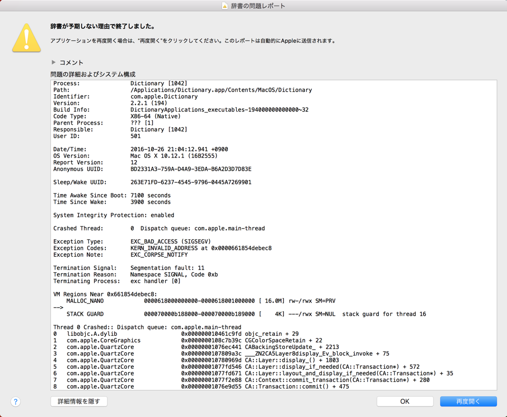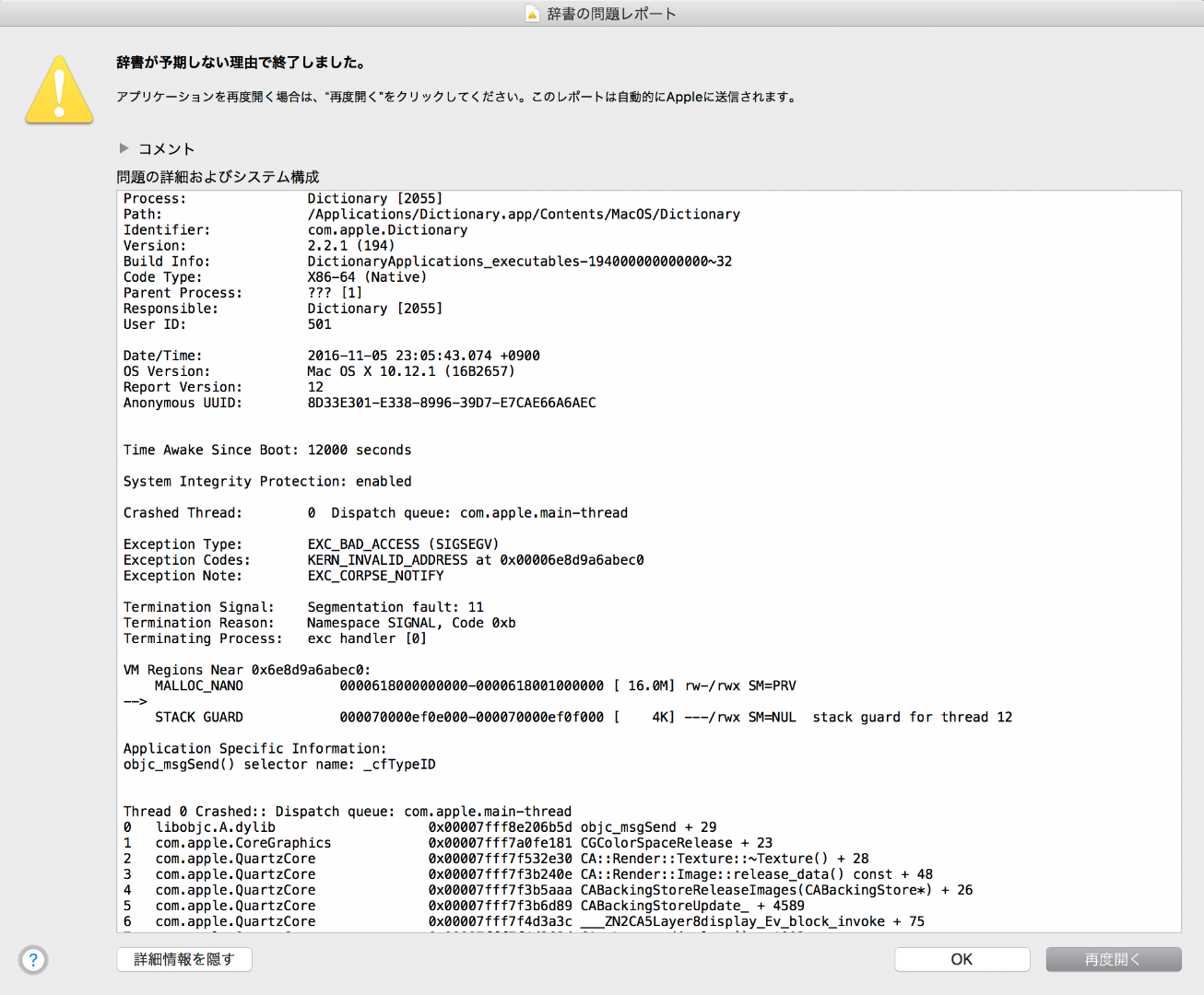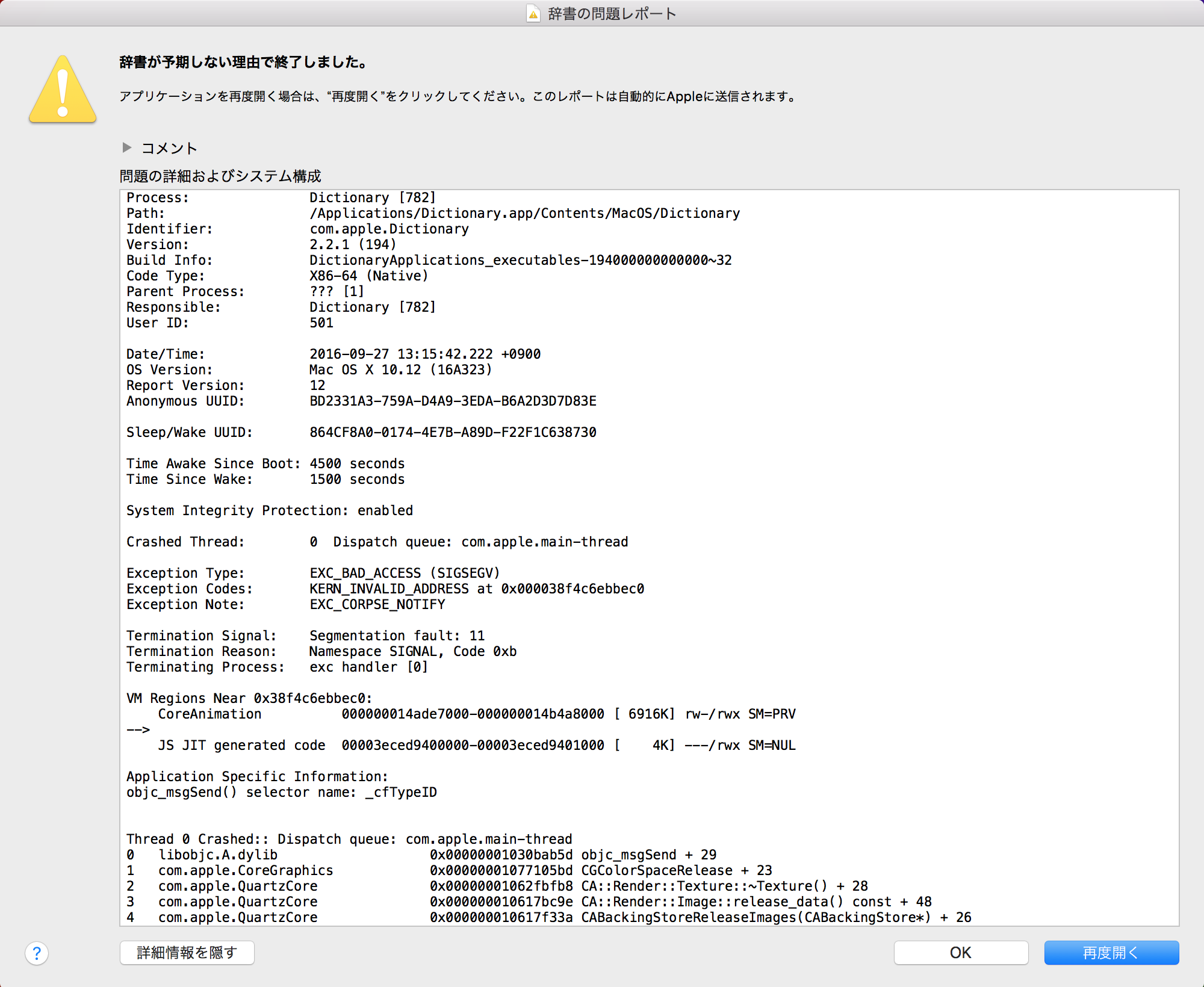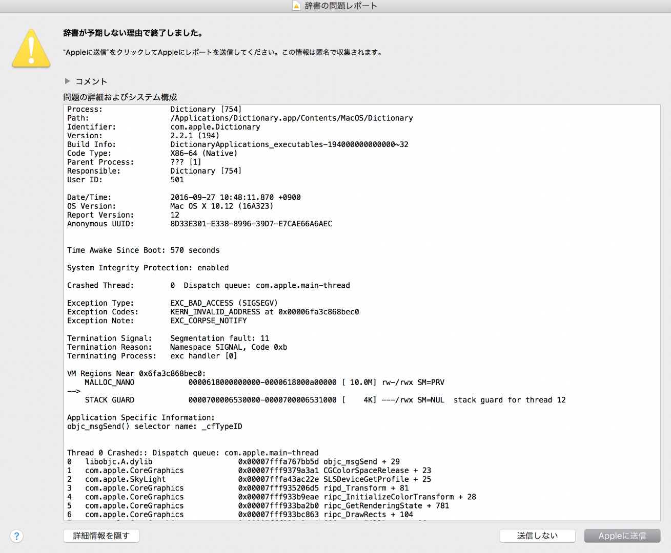 macOS Sierra10.12にしてから、辞書.appバージョン2.2.1 (194)がすぐに落ちます。