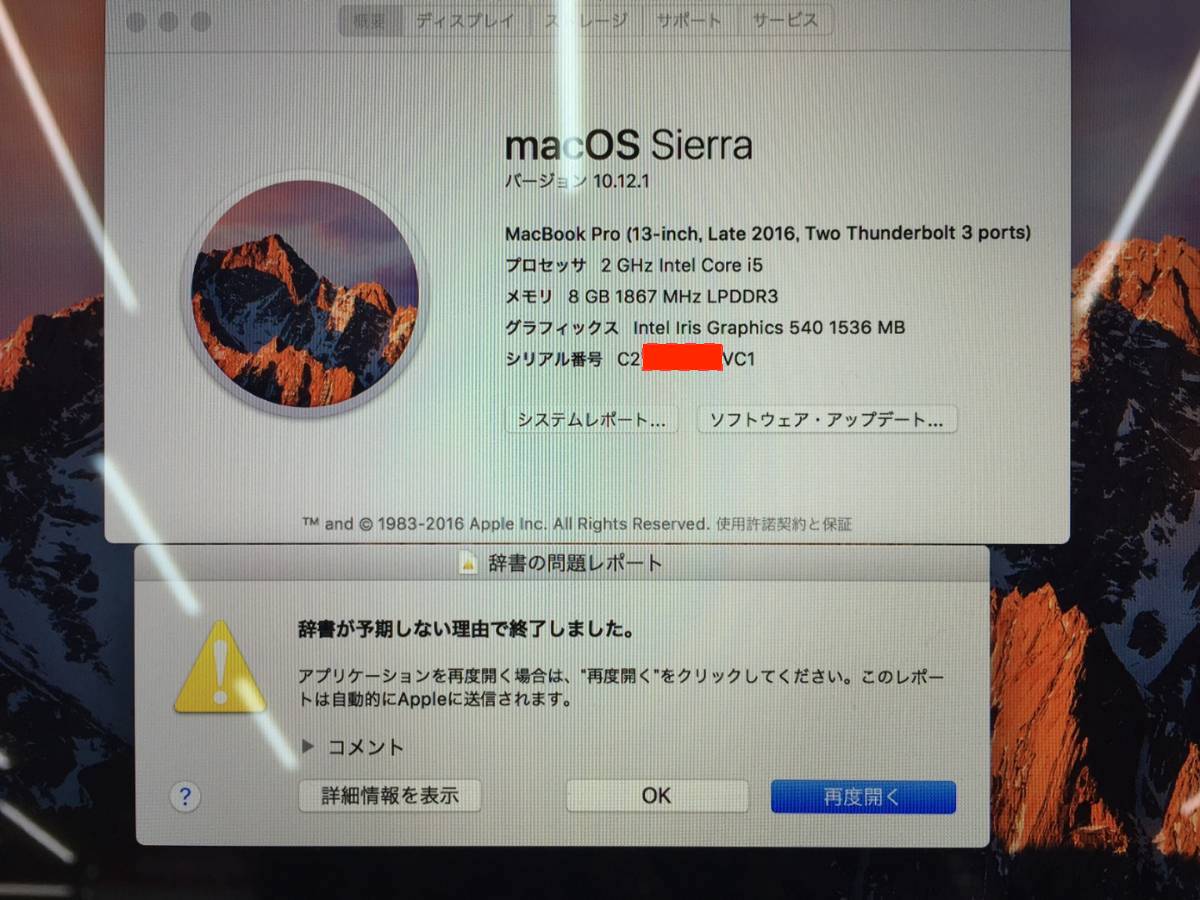 こちらもmacOS Sierra 10.12.1にしましたが、辞書.appが落ちる症状は同じでした。