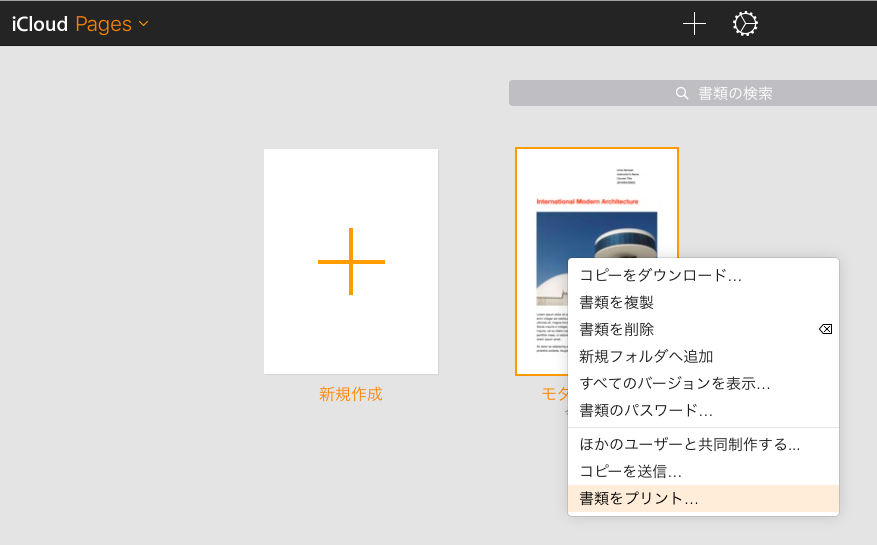 1. iCloud.com pages の初期画面(「新規作成」や既存書類の選択画面)で、既存書類のプレビューイメージの上で副ボタンクリック(2本指クリックや、control+クリック)し、コンテキストメニューの「書類をプリント…」を選択。