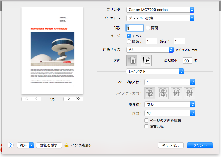 今回の文書では、SafariでPDFをプレビューしている時のプリントダイアログでは、「拡大縮小」が93%になっていて、