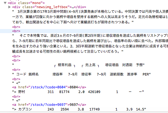 処理の考え方としては、まず、取り出したいデータの部分のHTMLのエレメントのクラス属性?がmonoという名前だったので、その部分を切り出して、テキストを抽出しています。 次に、” コード 銘柄名”から、”*売上高”の文字列の前の部分までを取り出し、スペース(半角と全角)の連続をタブに置き換えています。 行頭のスペースを取り除きたかったのですが、私の知識では無理でした。 なお、このような処理の性質上、他のページで実行してもデータを取り出せないと思います。