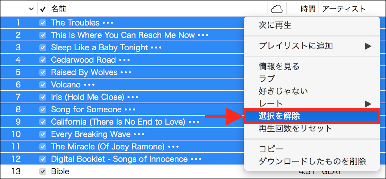 で、「選択項目のチェックマークを外す」みたいなものがあったと思うのですが、