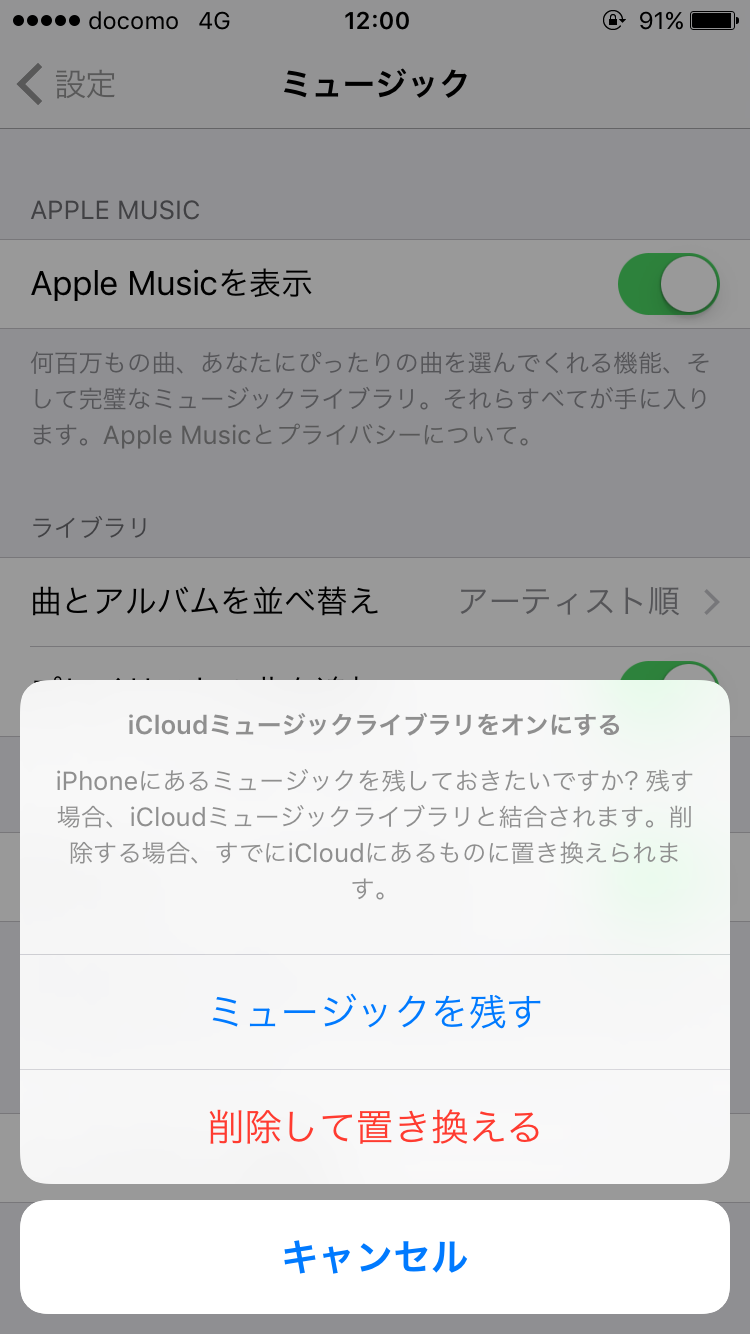 ※ いままで「結合」を選んでいたなら「ミュージックを残す」を、あるいは「置き換え」を選択されていたなら「削除して置き換える」を選んで(「iCoudミュージックライブラリ」の設定をタップして)決定するだけです(特に問題=今回の表示の不具合とは関係ありません)。