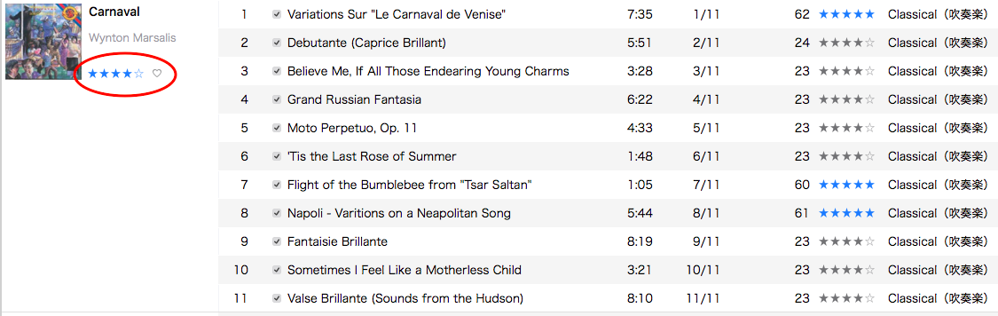 最初の星五つは自分でiPhoneにて登録した物でiPhoneに入っていて、下の四曲はiPhoneに入っていない。