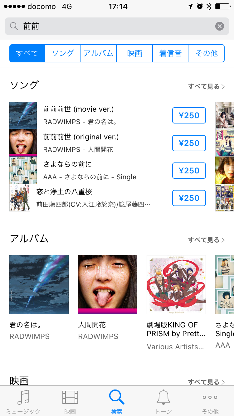↓端末上の「このiPhone 上に無いアイテム」にもでてきません(「radwimps」や曲タイトルで端末内検索しても前前前世はでてきませんので端末内にはありません。)