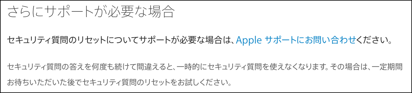 また、「セキュリティ質問のリセットについてサポートが必要な場合は、Apple サポートにお問い合わせください。」との事ですので、上記リンクの記事の通りに行ってもリセット出来ない場合は、下記リンクのページ、或いは電話番号から Apple サポートに問い合わせて見て下さい。