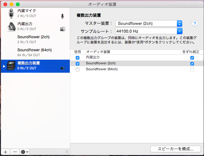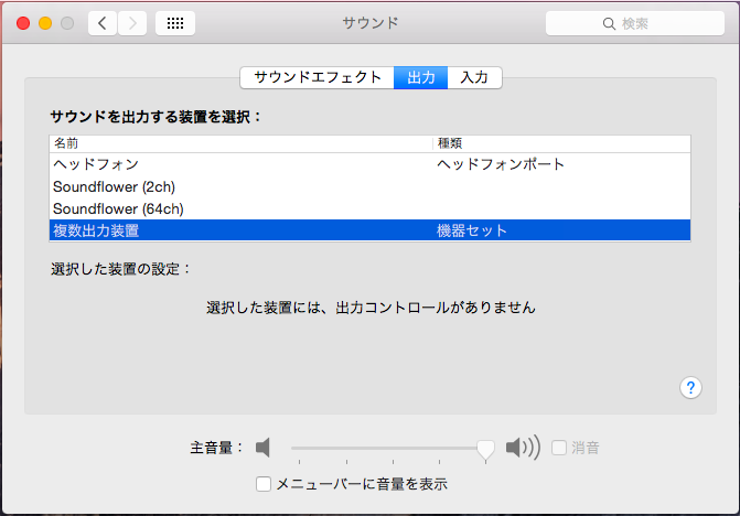 システム環境設定>サウンド>には、Soundflower(2ch)も、Soundflower(64ch)もあるんです!