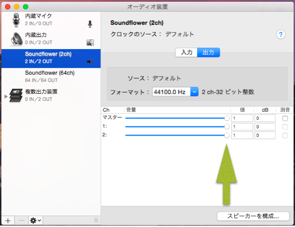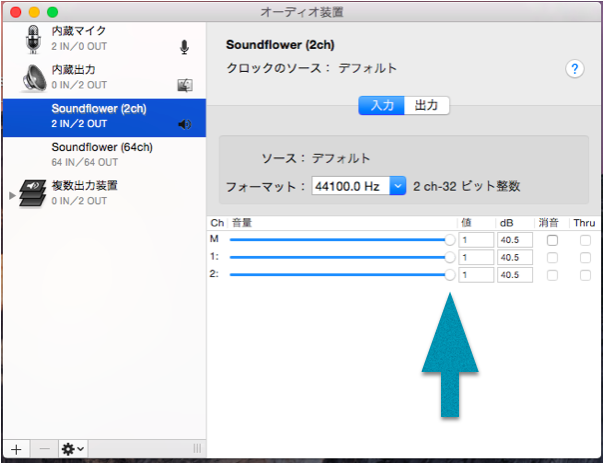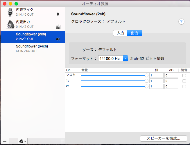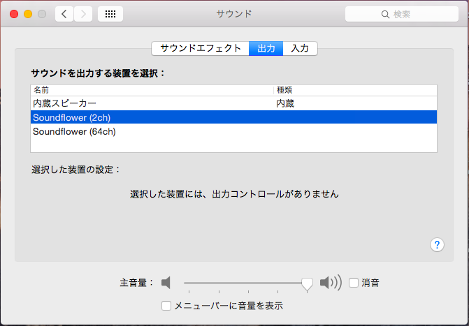 システム環境設定>サウンド>には、Soundflower(2ch)も、Soundflower(64ch)もあるんです!