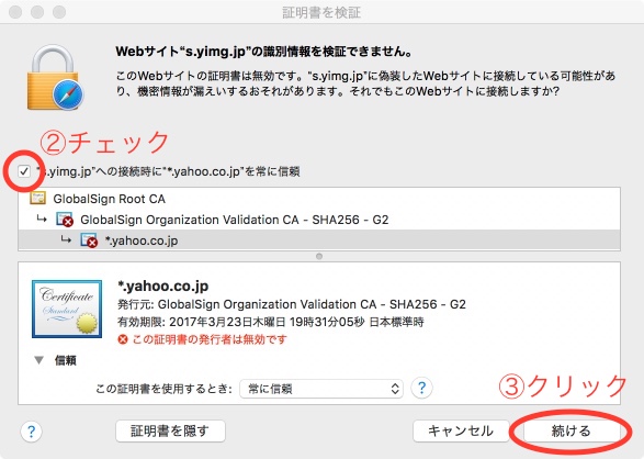 *.yahoo.co.jp がキーチェーンに現れたので、常に信頼 を選択すると