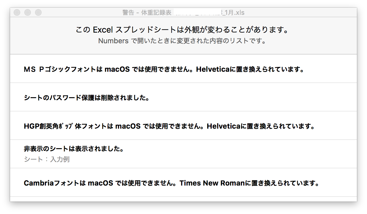 パスワード付きでブック保護、シート保護をし、シートを非表示にしているExcelファイルをNumbersで開くと、警告こそ表示されるもののパスワードも解除されすべてのシートが表示されてしまいます。