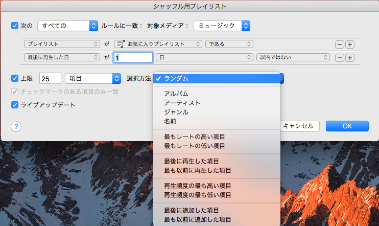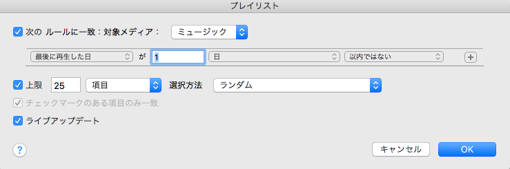 2. シャッフル用のスマートプレイリストを作成し下記のような条件を入れる