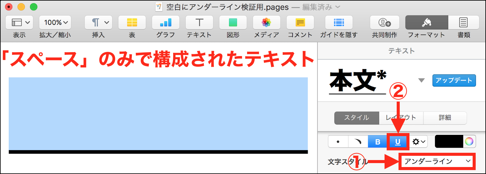 文章の文字の間にある空白ならば、普通に入れることができると思います(⌘U)。 → テキストにボールド、イタリック、アンダーライン、または取り消し線を追加する