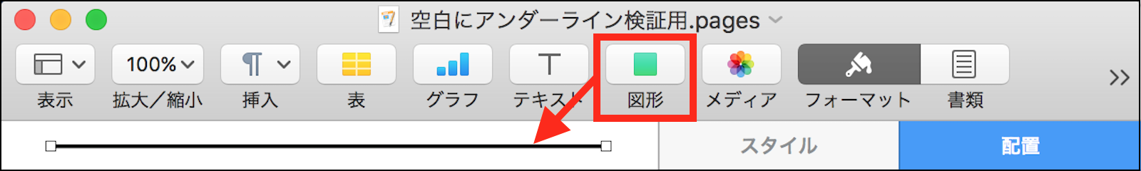 「スペース」も含め、テキストが何も入力されていない文字通り空白の状態で、「スペース」のみで構成されたテキスト部分にアンダーラインを入れる場合と外観上同じ様な効果を得たい場合は、ツールバーの「図形」>「直線」を選択して下さい。