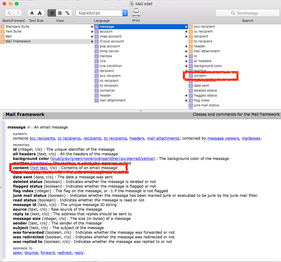 2)受信したメール(メッセージ)のオブジェクトがあれば、そこからcontentのプロパティを取得します。 例えば、以下のスクリプトは、Macにインストールされていたメールルールのサンプルに少し手を加えたものですが(動作は未確認です)、set theContent to content of eachMessageの部分でメールの本文を取り出しています。