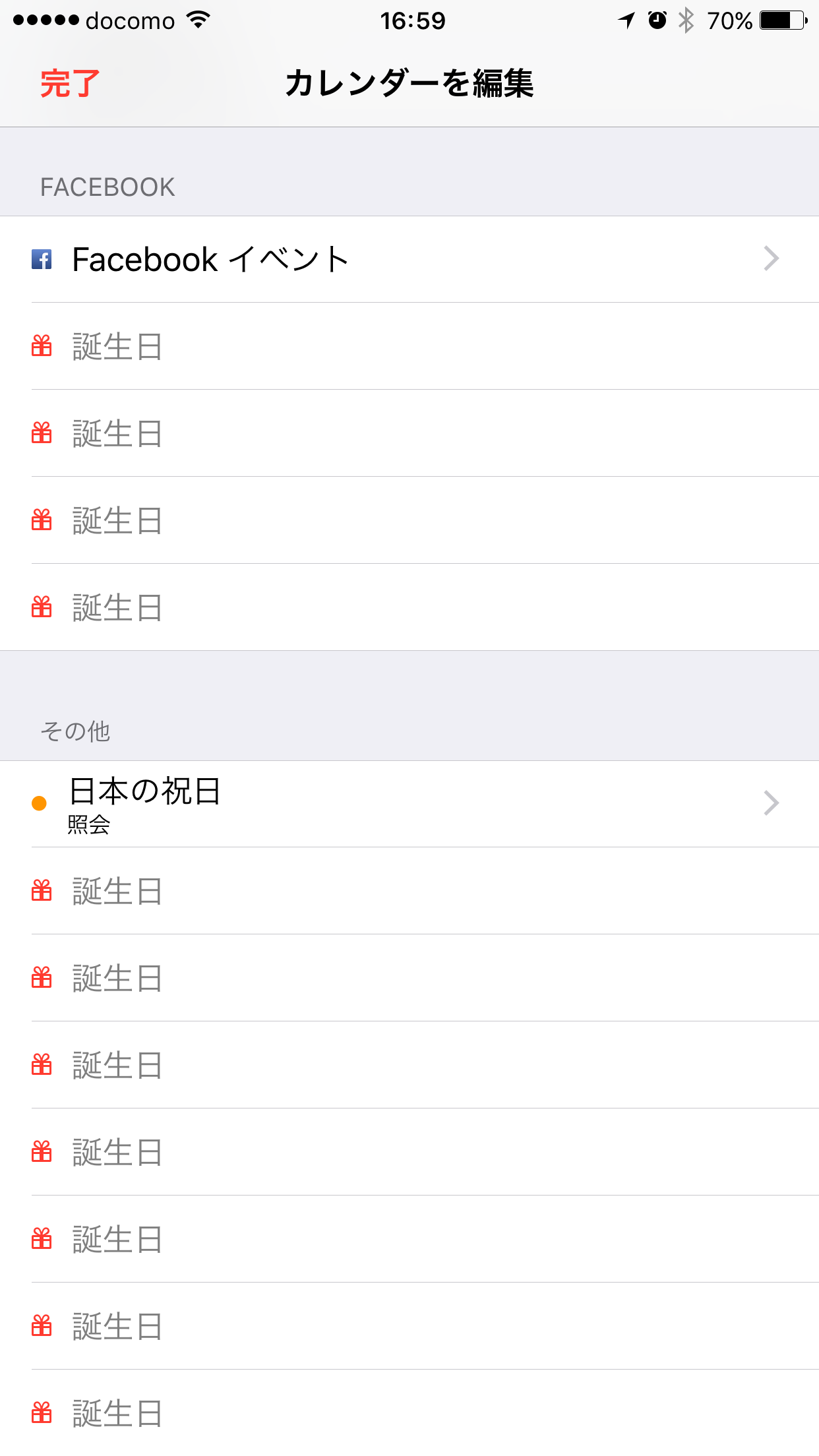 当初は問題なかったと思うのですが、気付いた時にはカレンダーのその他に誕生日が162件、FACEBOOKの誕生日が4件あり、編集からも削除できません。
