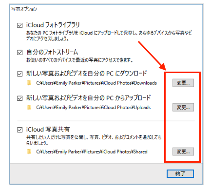 『変更』というのは、Windows用のiCloud設定アプリを開いて、写真の項目にあるオプションボタンを押した時に表示されますね。