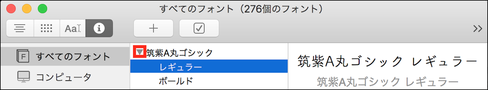 「Finder」で /Library/Fonts フォルダ内を確認すると、「TsukushiAMaruGothic.ttc」ファイルが有るかと思いますが、それをダブルクリックしても「Font Book」に「FOT - 筑紫 A 丸ゴシック R」は表示されませんでしょうか?