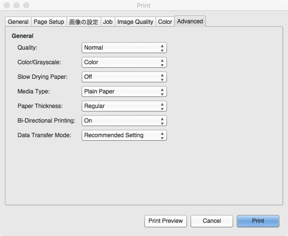 そこで一度PDFで書き出し(コントロール+PからPrint Preview)、それを印刷したところ、カラーでできました。
