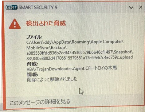 誤検出か何かの添付ファイトして存在するとかではないでしょうか。iPhone のバックアップから勝手に消されると破損扱いで復元できない可能性があります。暗号化して削除を回避してはいかがでしょうか。お書きのウイルスをネットで検索するとWindows のExcel とかでないと動かないそうです。