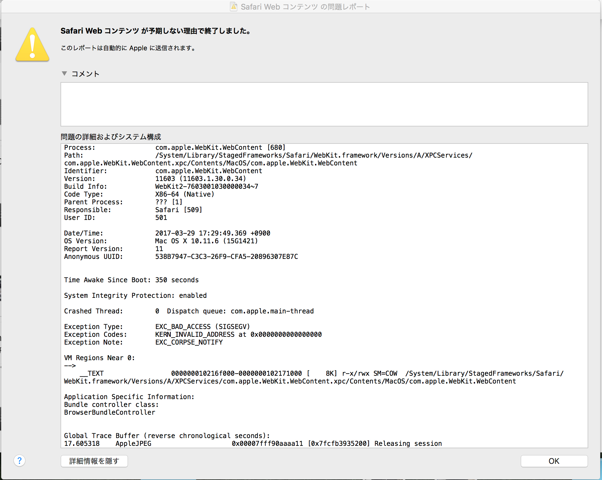 私もEl Capitan環境で同様のエラーが発生して困っています。safariバージョン 10.1 (11603.1.30.0.34)です。