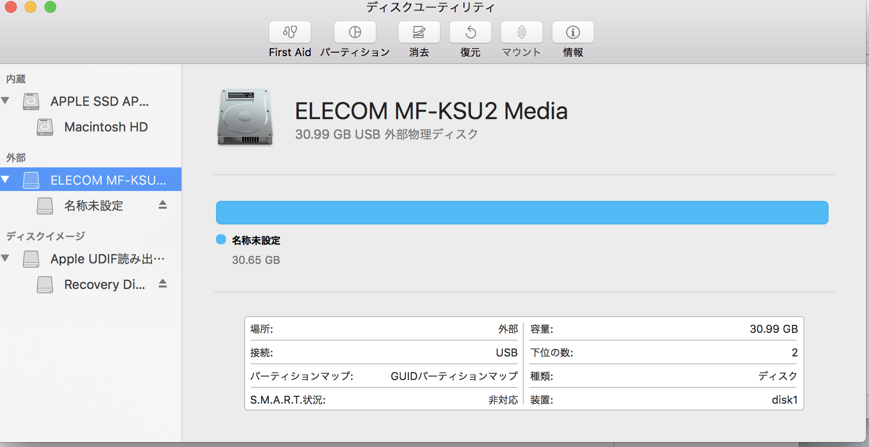 後は、ディスクを選択した状態で、情報をクリックして赤字で何か表示されてないか確認してみる等、やっぱり何か変なので。ボリュームがdisk1s2から名称未設定 1になった段階でS.M.A.R.T状況が未対応になってるのが気になりますが、こんな感じでしたっけ?