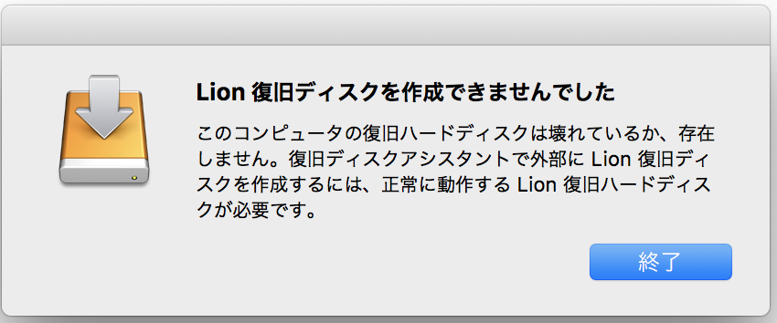 ↑こちらのページを参考にさせてもらい、USBメモリをMacで起動できるディスク仕様に変更して(添付画像1)、アップルのサイト(OS X 復元ディスクアシスタント)からダウンロードした復旧ディスクアシスタント.appを開くと、『Lion復旧ディスクを作成できませんでした』となり(添付画像2)、作成できませんでした。