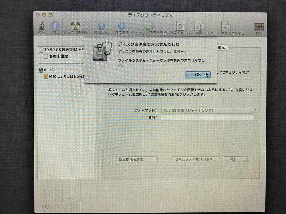 済みません。前のレスの時はよく見てなかったのですが、お示しのディスクユーティリティの画面だと内蔵ディスクは見えてませんが、どのディスクを消去しようとされてますか?