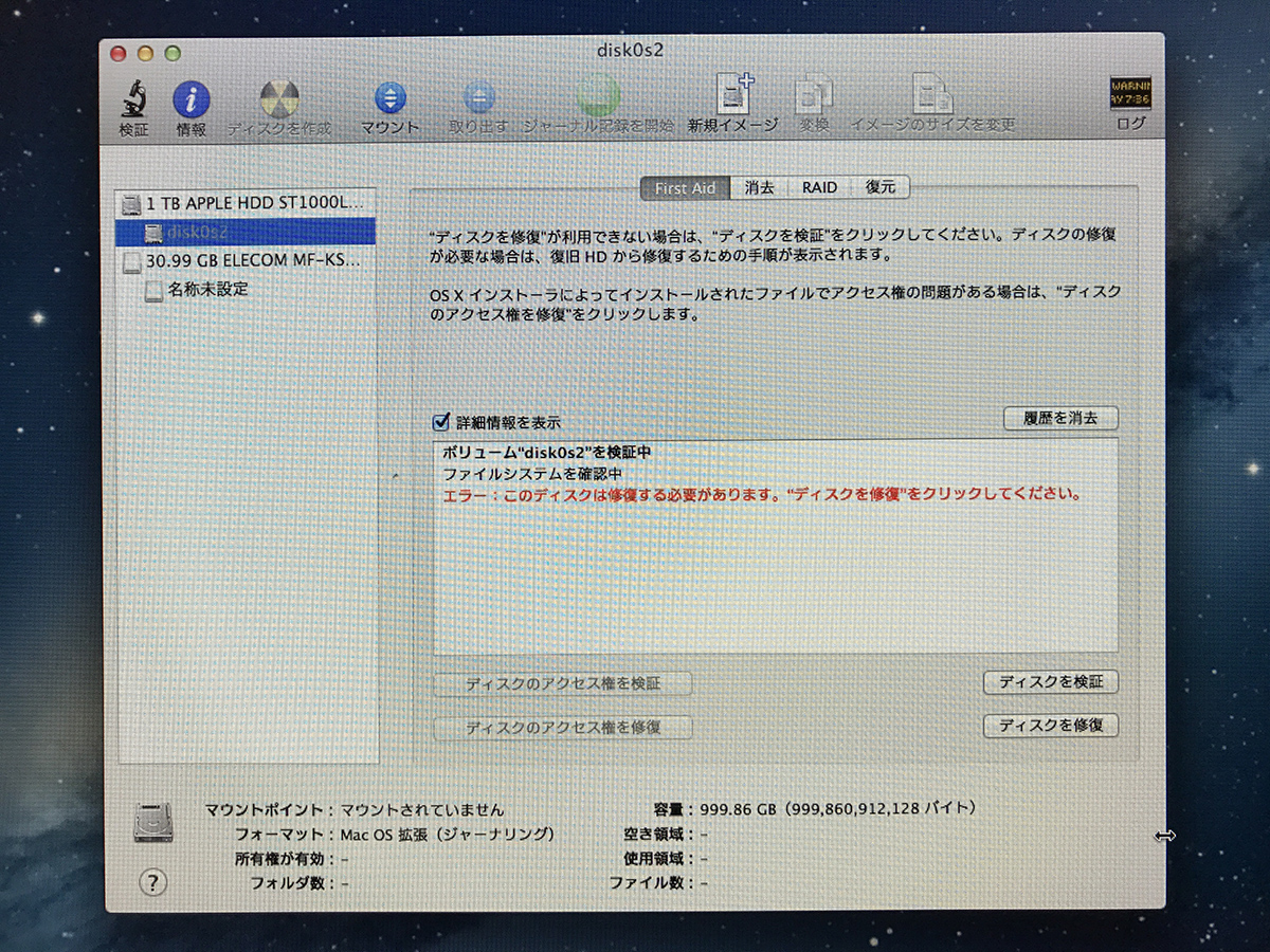 それと、ディスクユーティリティの左上に検証ボタンがあります。 検証してみてエラーがでるようならHDDの故障と断定してもいいのではないかと思います。