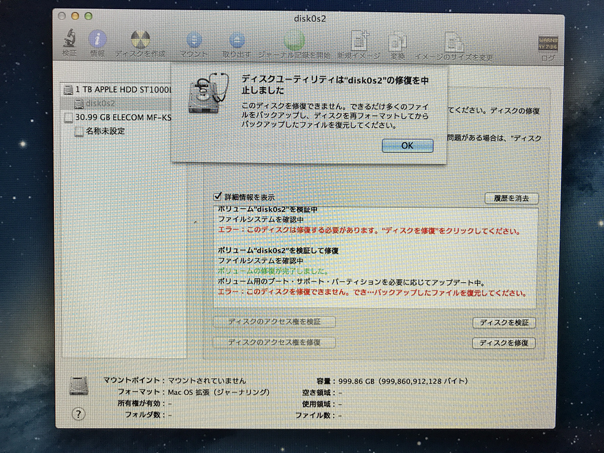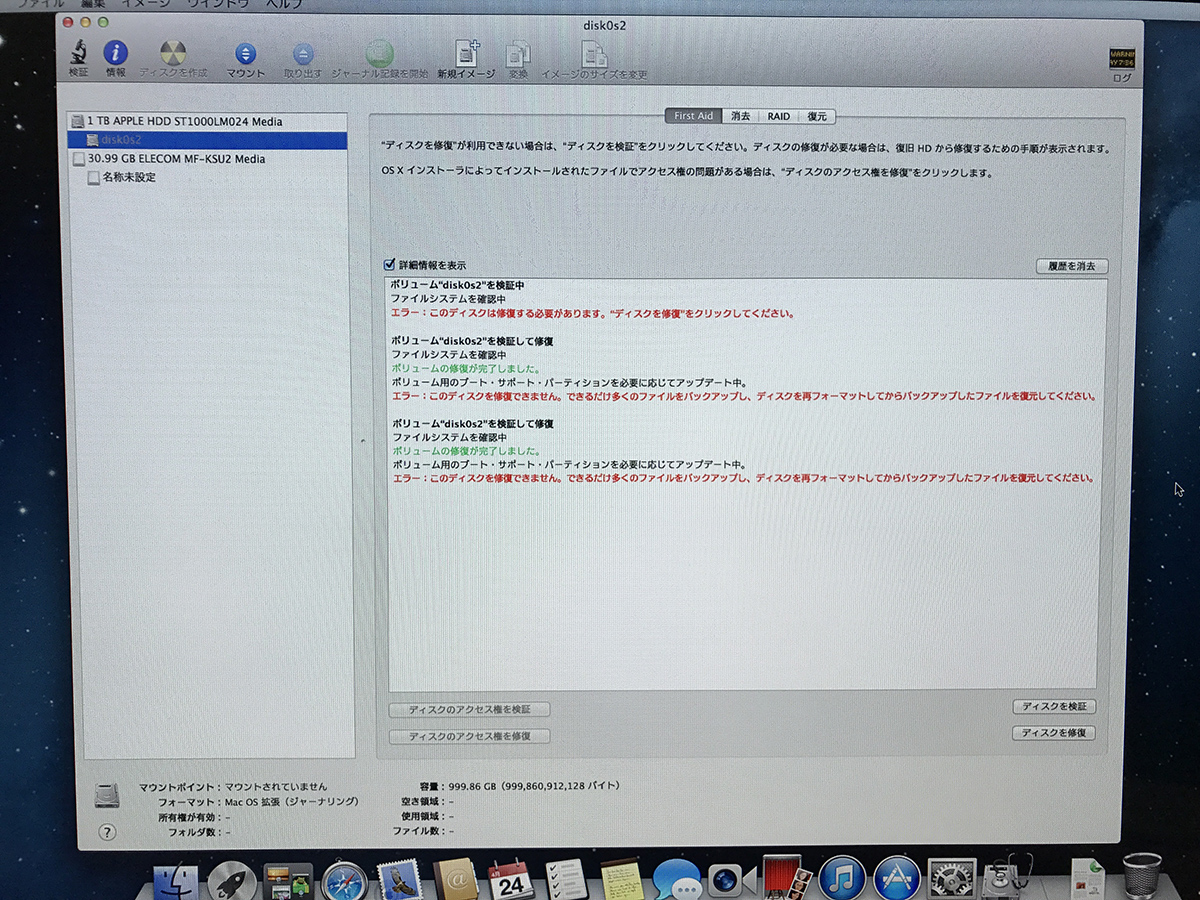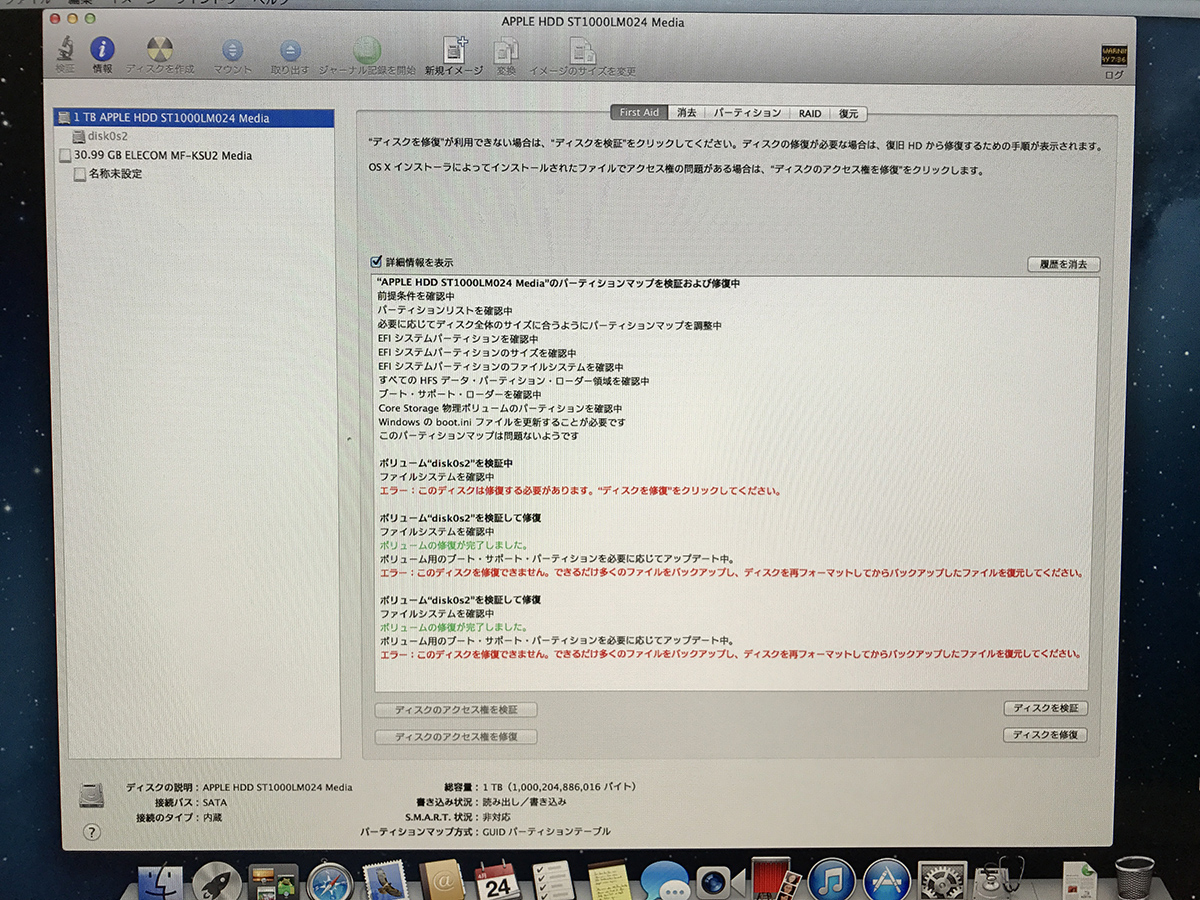 これでもやはりエラーになるようなら、やはり、HDDは正常じゃないと考えられますので、交換修理が必要です。このディスクユーティリティでの処理が正常に完了さえすれば、OSXのインストールは何の問題もなくできると思います。