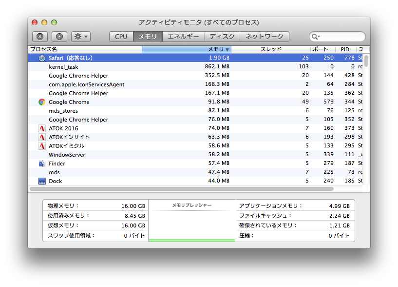 それでも改善しない場合は Safari を起動してからアクティビティモニタを起動してメモリリークが起きていないかどうか確認してください。