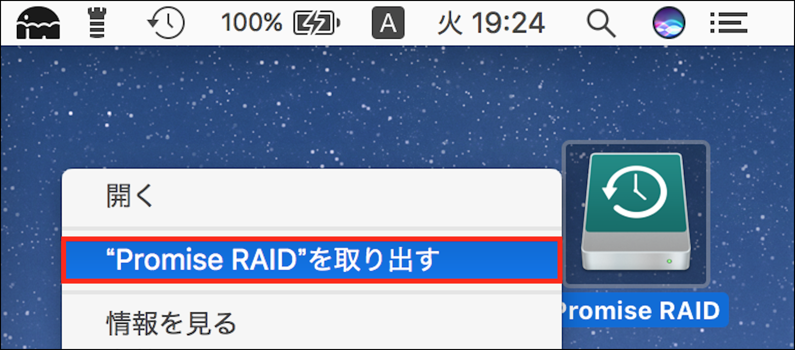 デスクトップ上の「Time Machine」アイコンを右クリックすると表示されるコンテキストメニューから、「“ Time Machine のバックアップボリューム名」”を取り出す」をクリックしたと言う事ですよね?