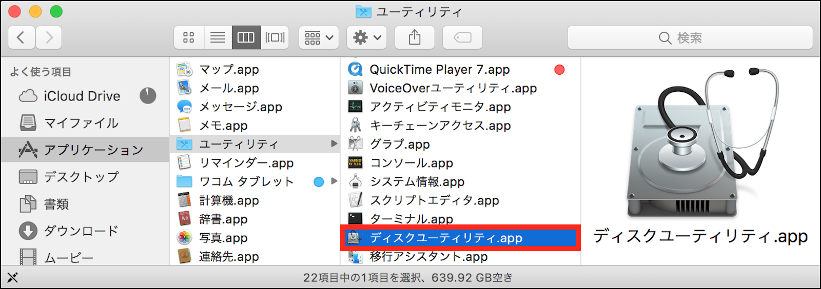 つまり、「Time Machine」のバックアップボリュームをアンマウントしたと言う事ですから、「Finder」を開き、「アプリケーション」フォルダ内の「ディスクユーティリティ.app」をダブルクリックして起動して下さい。