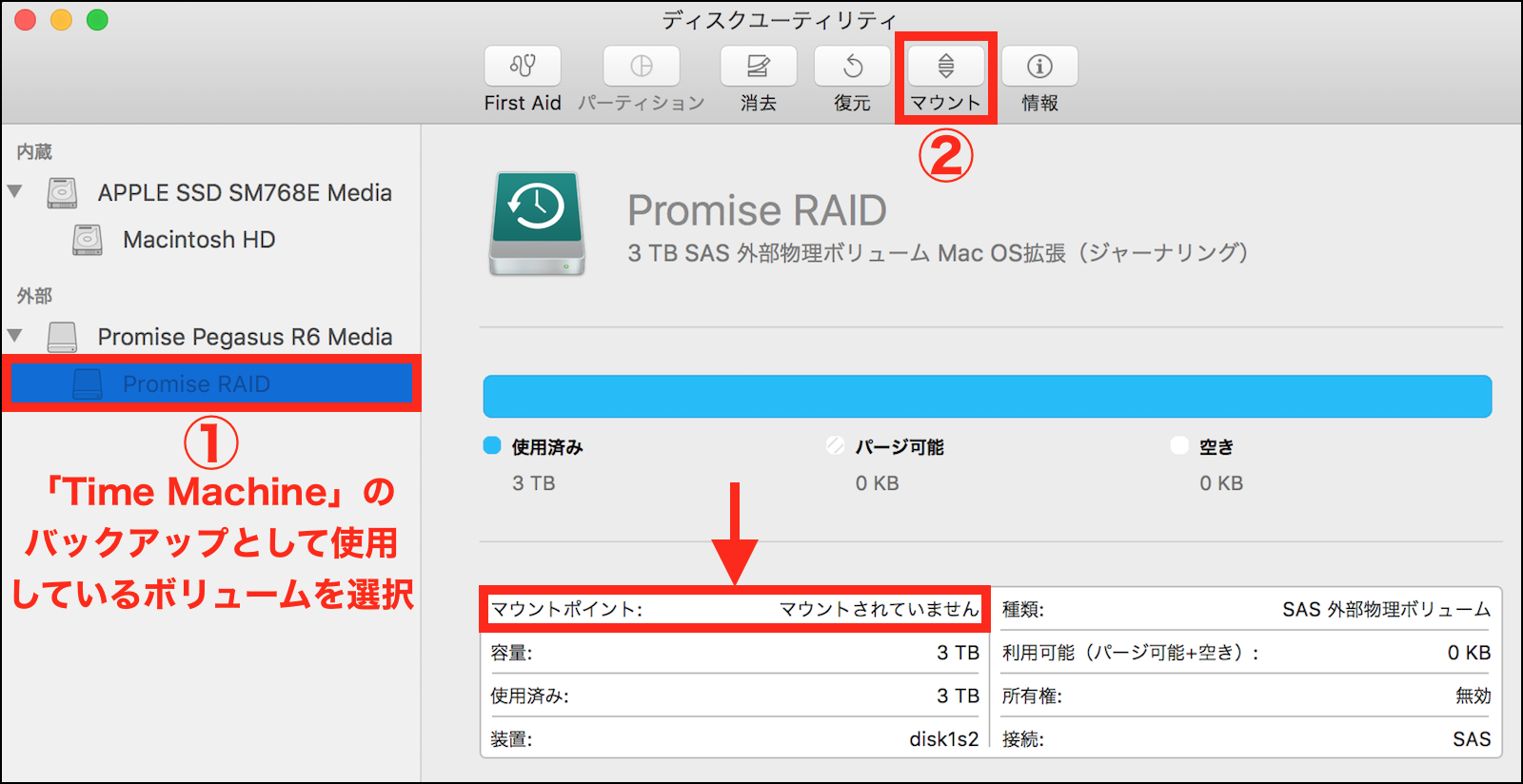 サイドバーの「Time Machine のバックアップボリューム」を選択すると、「マウントポイント」の項目が「マウントされていません」と表示されているはずですので、ツールバーの「マウント」ボタンをクリックして下さい。