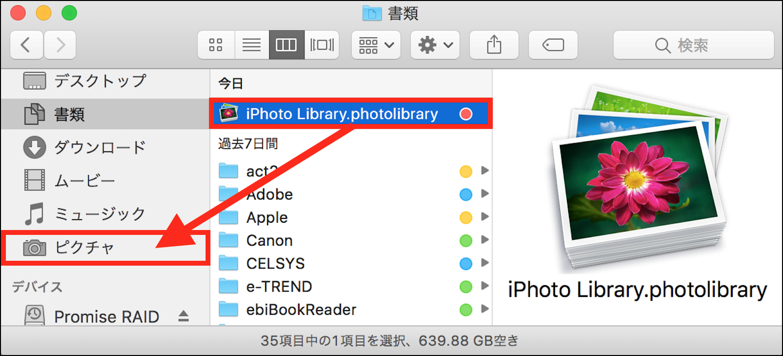 「Finder」で「すべての書類」フォルダ内の「iPhoto ライブラリ」をサイドバーの「ピクチャ」フォルダにドラッグ&ドロップして下さい。