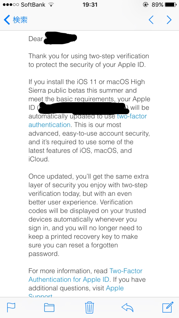 1)お使いのApple IDに2ステップ確認を設定されていますか? また、ベータブログラムに参加されていますか? そのメールの内容はベータプログラムでiOS 11やmacOS 10.13を使う場合は、Apple IDの2スタップ確認が自動的に、2ファクタ認証に変更されるというものです。 文面の内容は特に不審なものではありません。