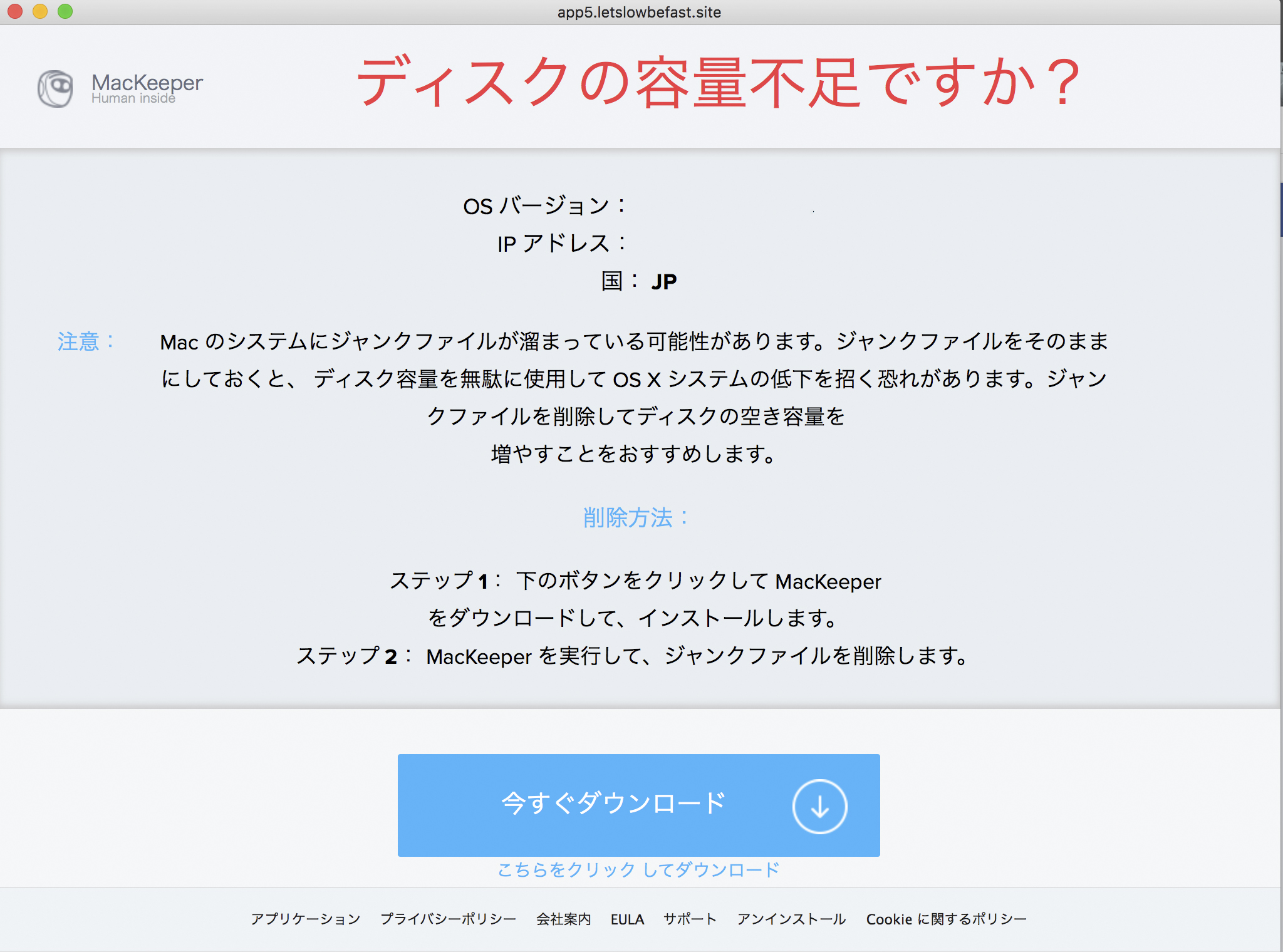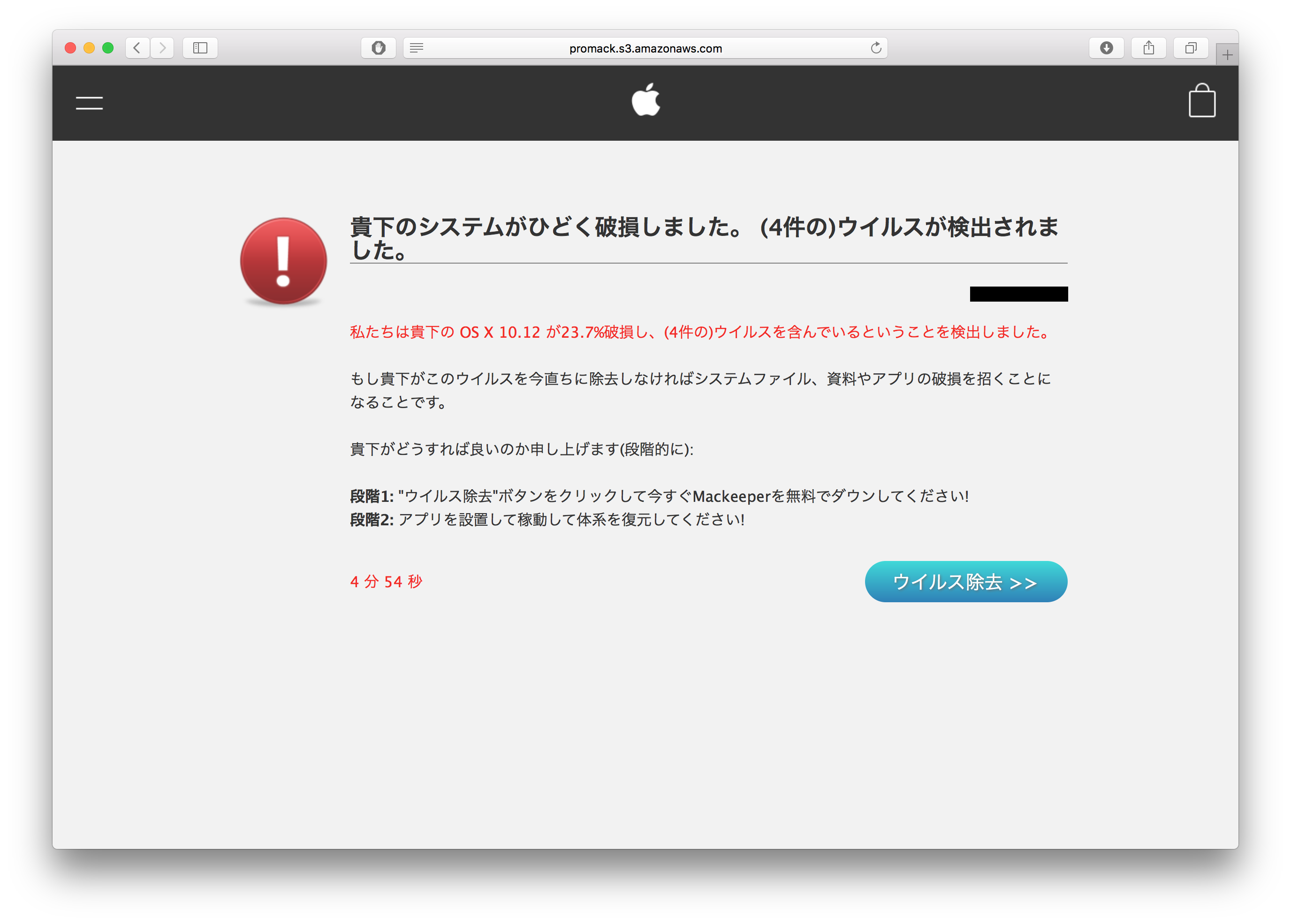 写真を数点、アクセスしていたら、突然、偽Appleが現れて、ウィルスを検出したので、直ちにMacKeeperとか購入せよという感じです。すぐ、別のページ移動したので、何も入力しなかったのですが、ウイルスに汚染されていないか、心配ですが、、