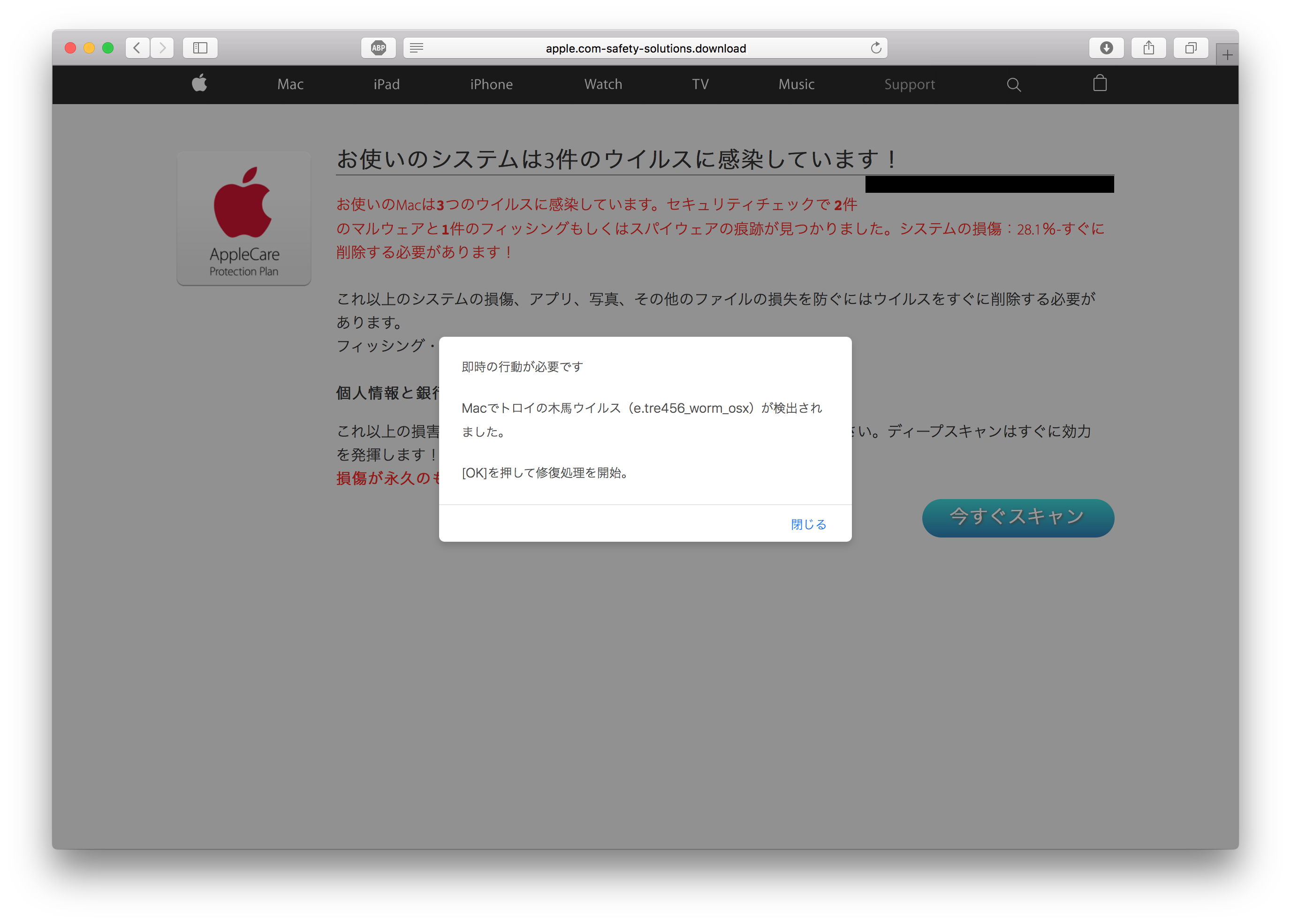 先ほど、偽Appleサイトによるウイルス検出に対して、どう対応したら良いでしょうか?