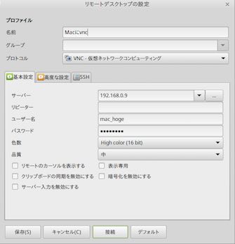 Linux側はVinagreをインストールしました。IPアドレスで確認すると自分のMac名が正しく出ています。認証画面までは問題なく接続出来ています。