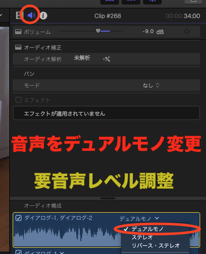 いくつか効果音やBGMを使用しているので、それぞれのオーディオでデュアルモノに変更したのですが、