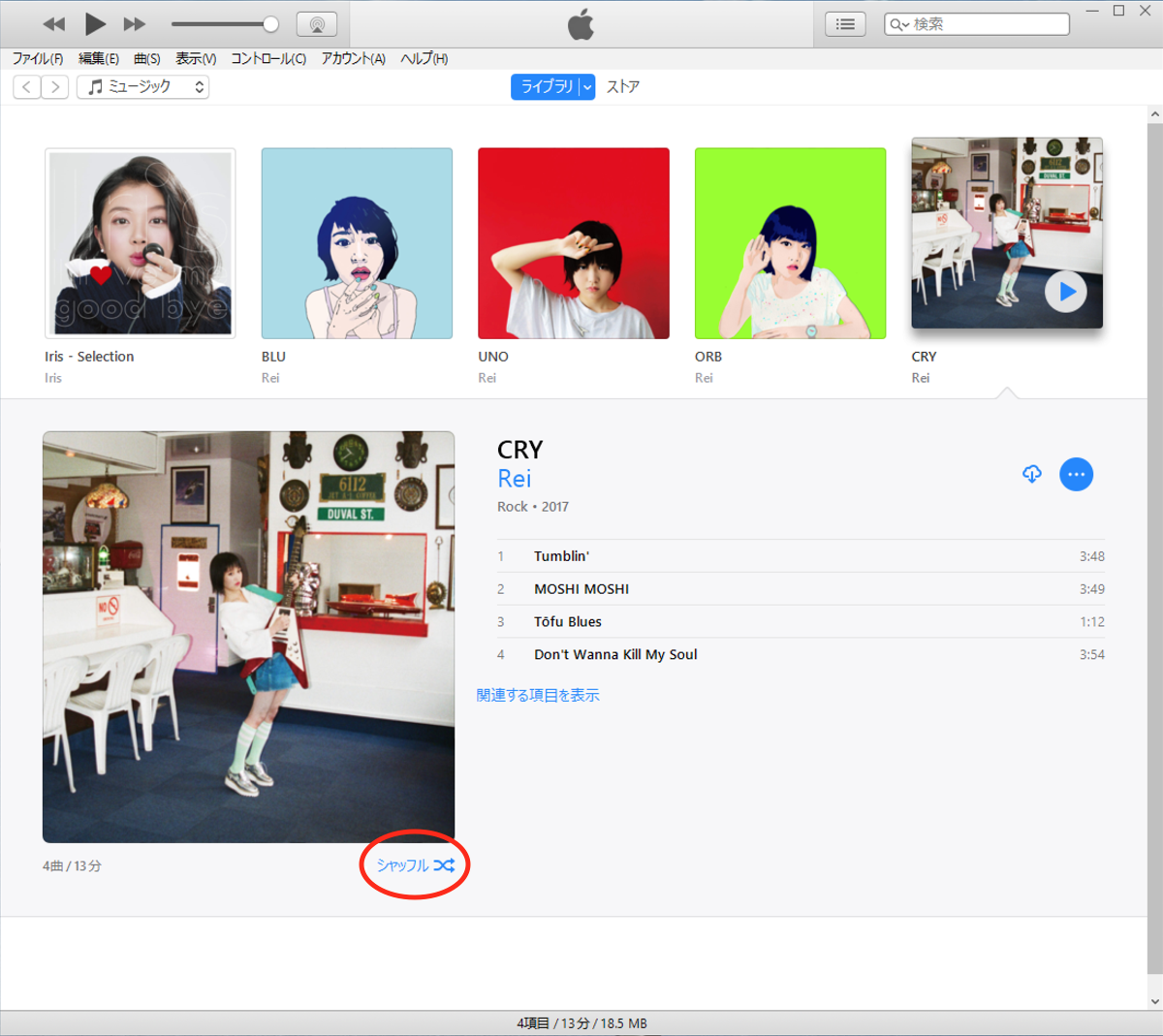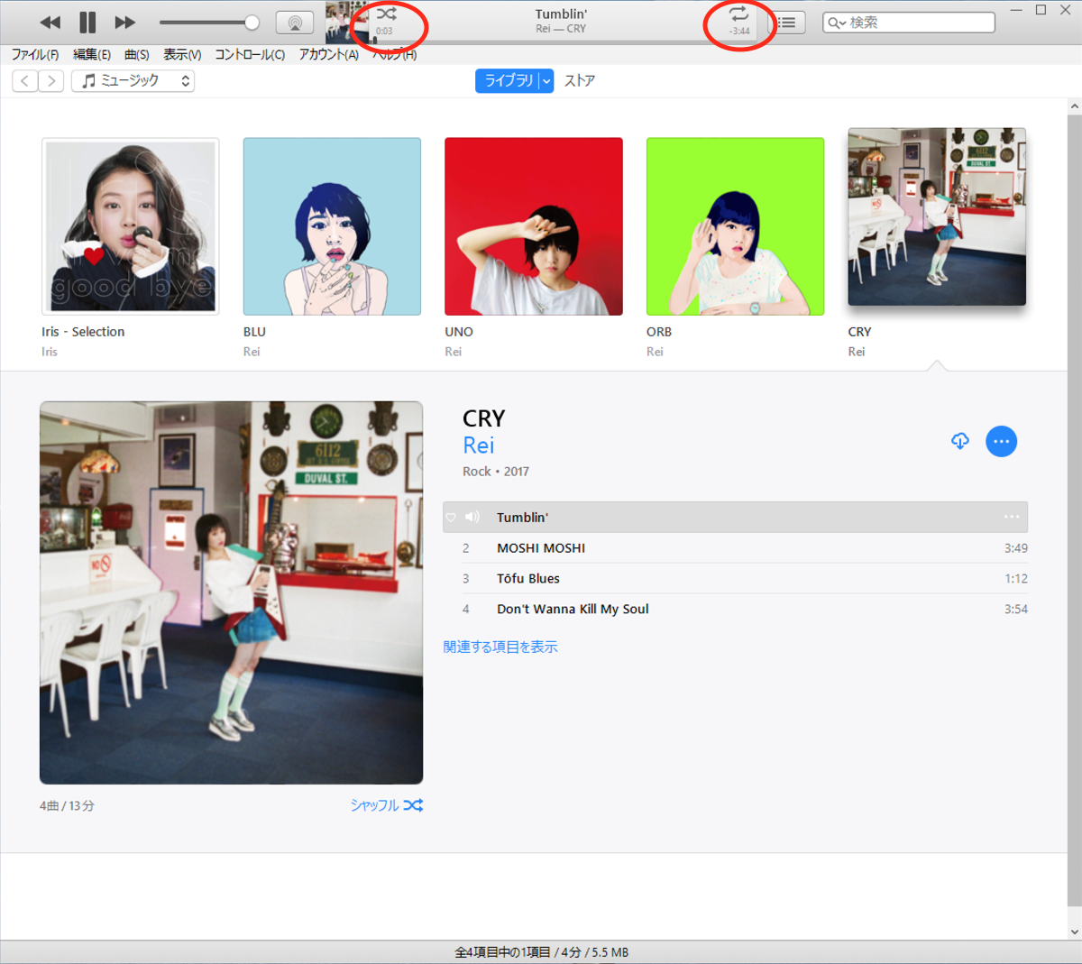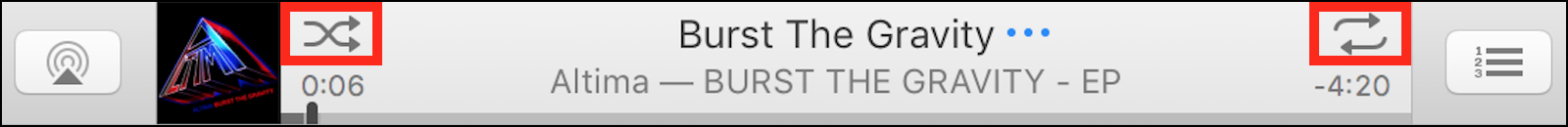 只、サイドバーの「Genius Mix」の曲を再生している場合や「Genius シャッフル」を有効にしている場合は、下の画像の様に「シャッフル」や「リピート」アイコンは表示されません。