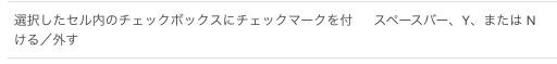 チェックを入れたい、或いは外したいチェックボックスのセルを選択し、チェックを入れたい場合は「1」キーを、チェックを外したい場合は「0」キーを押して下さい。