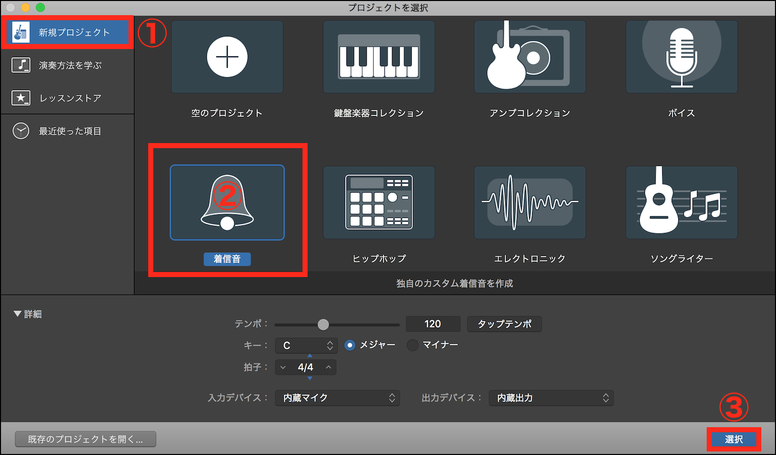 ② 「GarageBand.app」を起動して、「ファイル」メニュー >「新規」を選択すると表示されるパネルで、下の画像の様に、サイドバーの「新規プロジェクト」>「着信音」>「選択」ボタンの順にクリック。