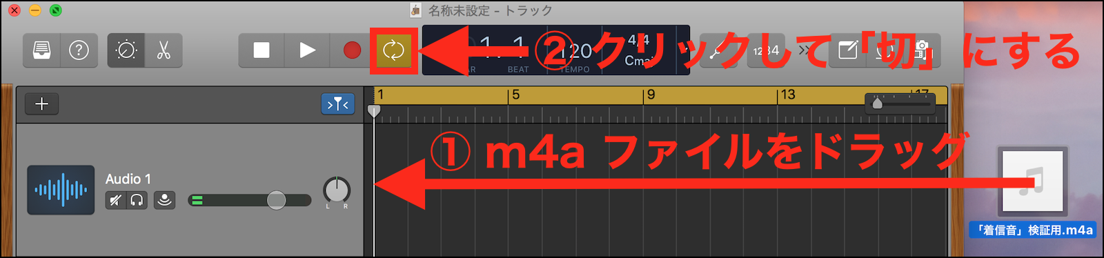 ③ デスクトップ上の m4a ファイルをトラックの左端にドラッグし、ツールバーの下の画像赤枠部分の「サイクル」ボタンが「入(黄土色)」になっていると思いますが、初心者との事ですので自動で調整を行う為に、クリックして「切(灰色)」にして置いて下さい。